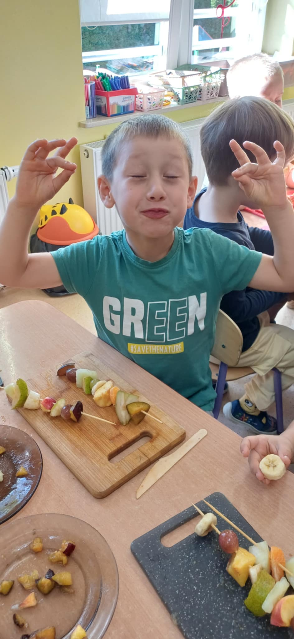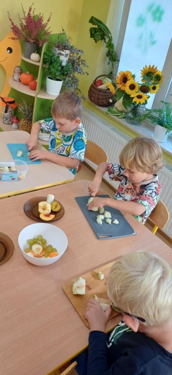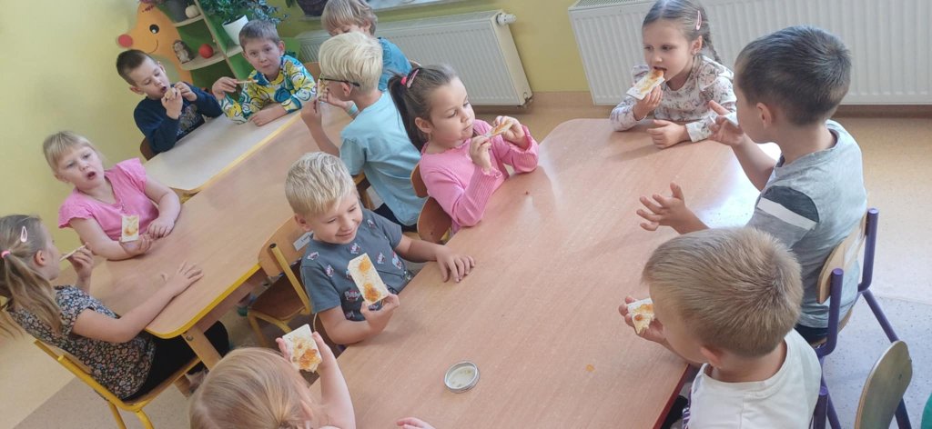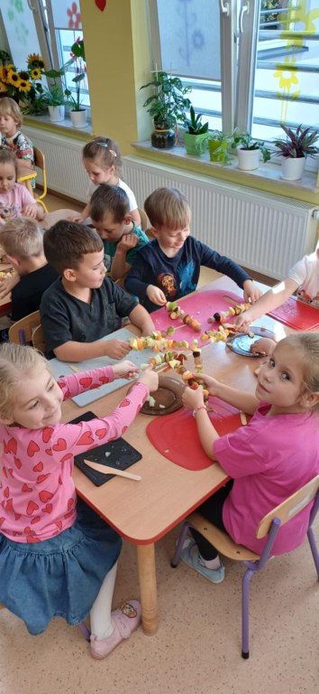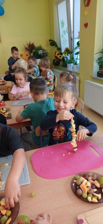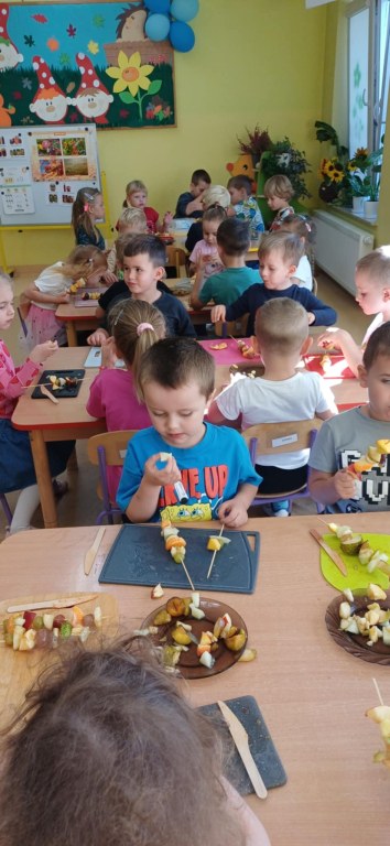 Dzieci z grupy VI ramach tematu kompleksowego ,,Koniec lata w sadzie i w ogrodzie ” poznały smaki i zapachy wczesnej jesieni smakując konfiturę, oraz wykonały samodzielnie owocowe szaszłyki.