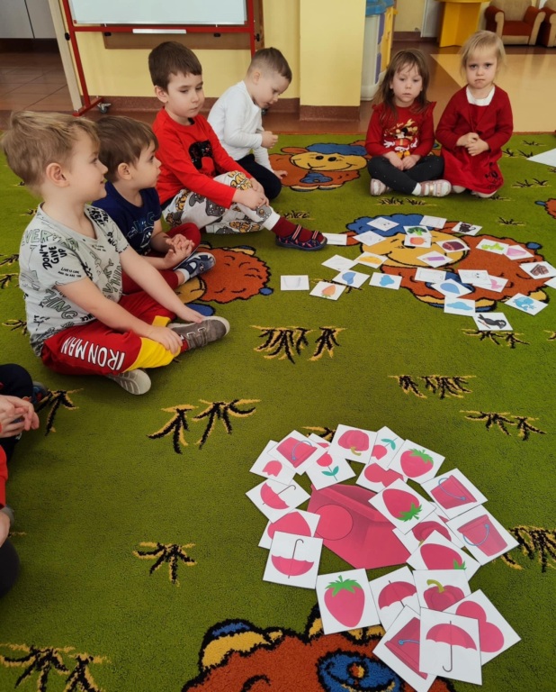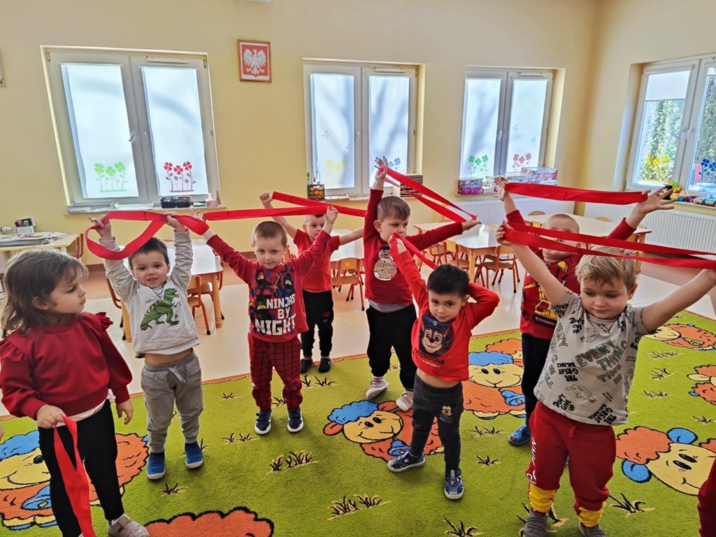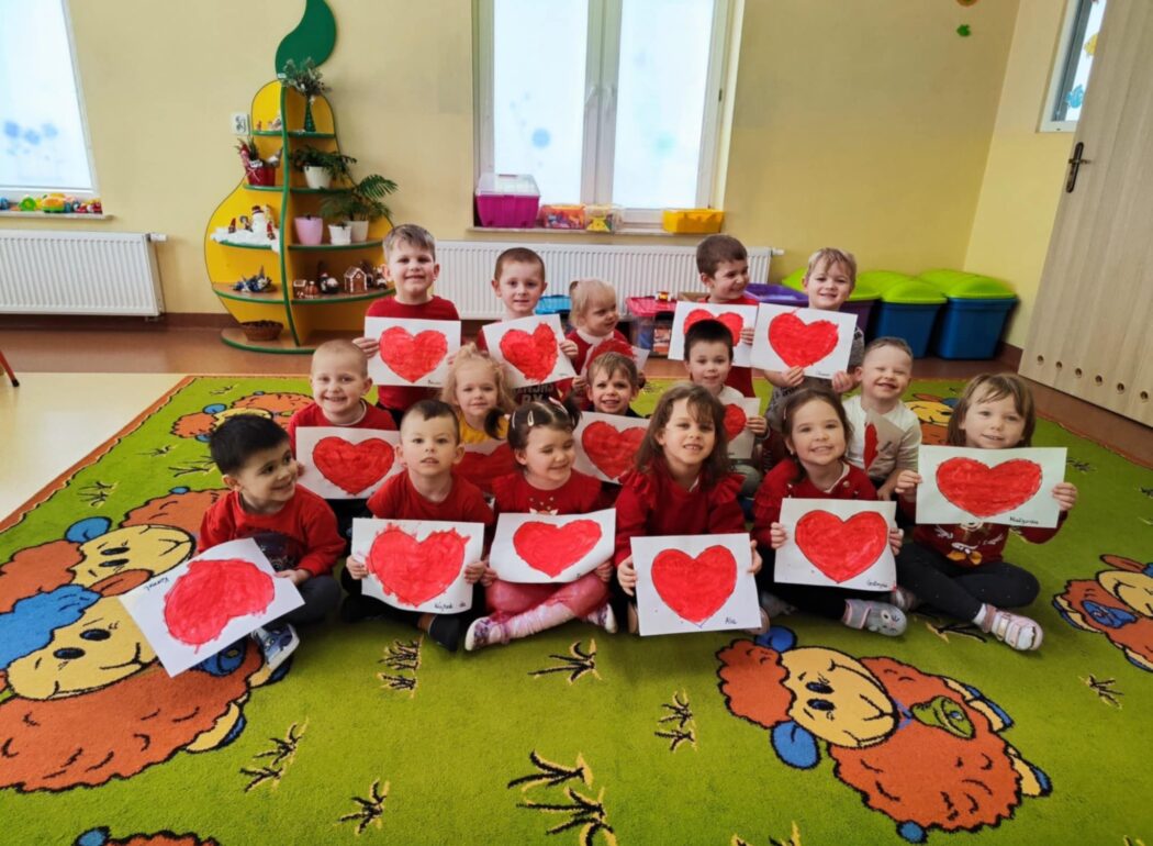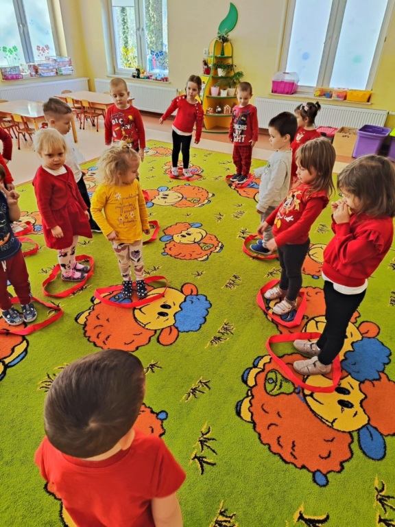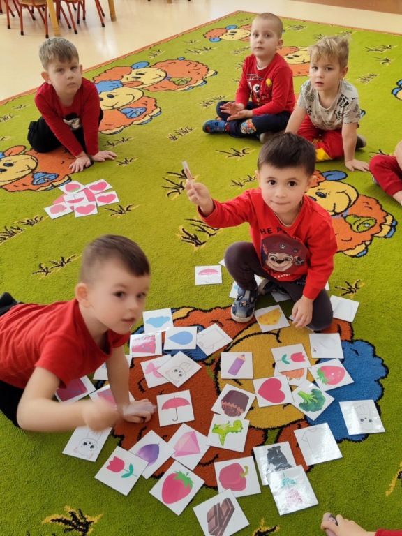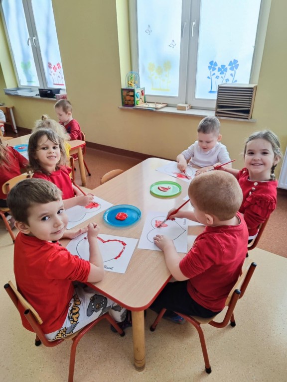 Grupa II w ramach projektu „Poznajemy kolory z Kicią Kocią” tym razem uczyła się rozpoznawać kolor czerwony. Dzieci z ogromnym zainteresowaniem bawiły się z szarfami, poznając przy tym nowy kolor. Chętnie i poprawnie odnajdywały kolor czerwony w najbliższym otoczeniu. Na koniec zajęć malowały czerwone serca dla swoich najbliższych, co połączyliśmy z niedawno obchodzonymi Walentynkami.