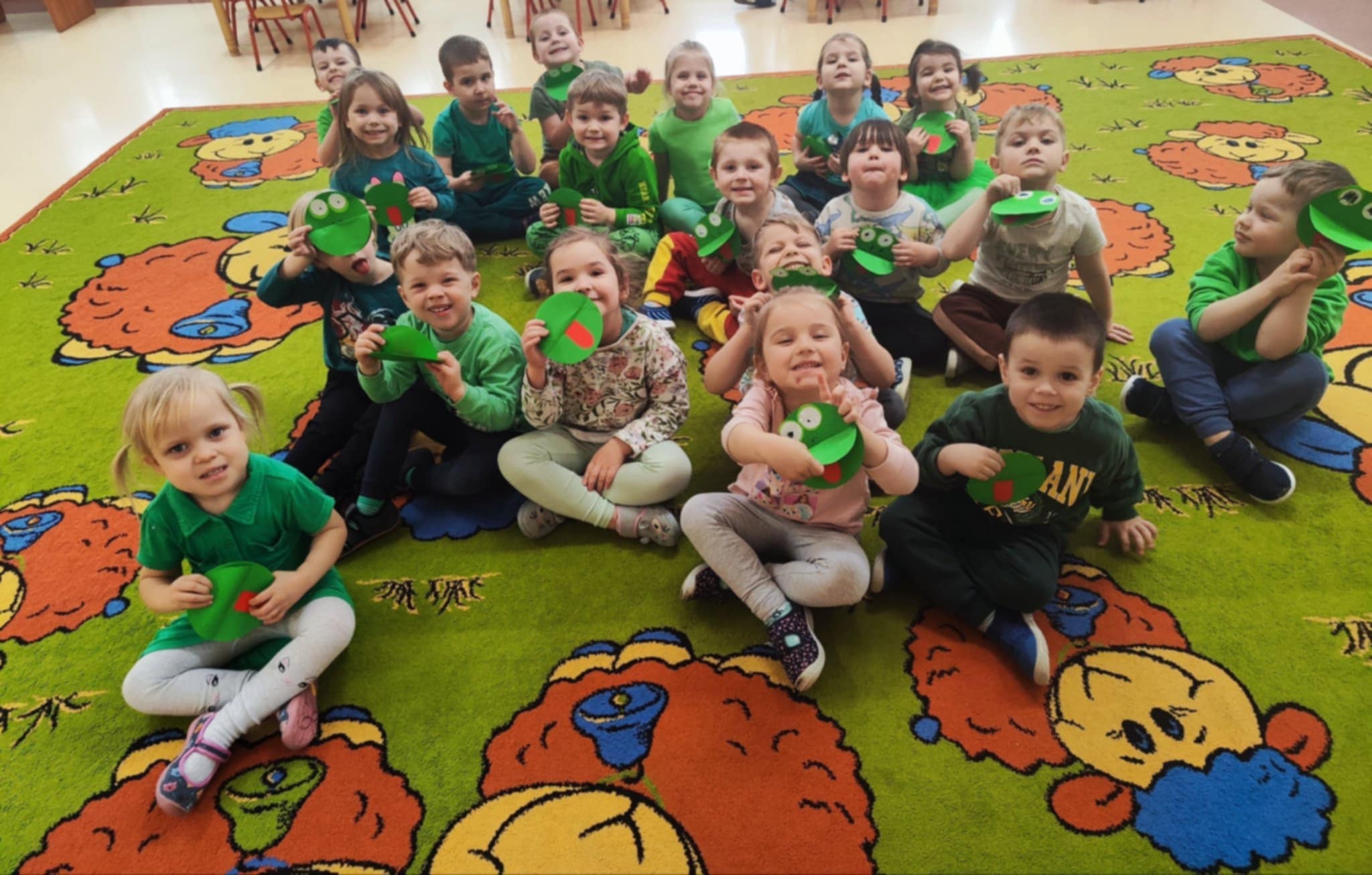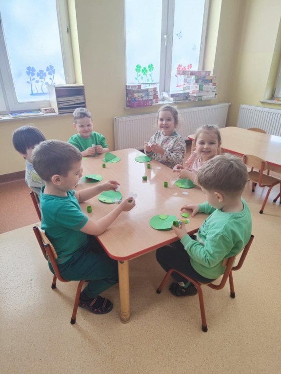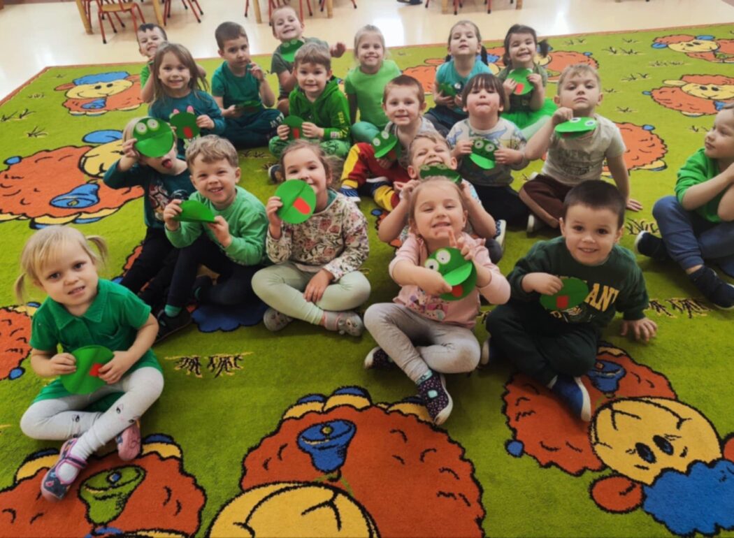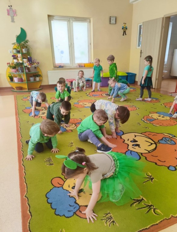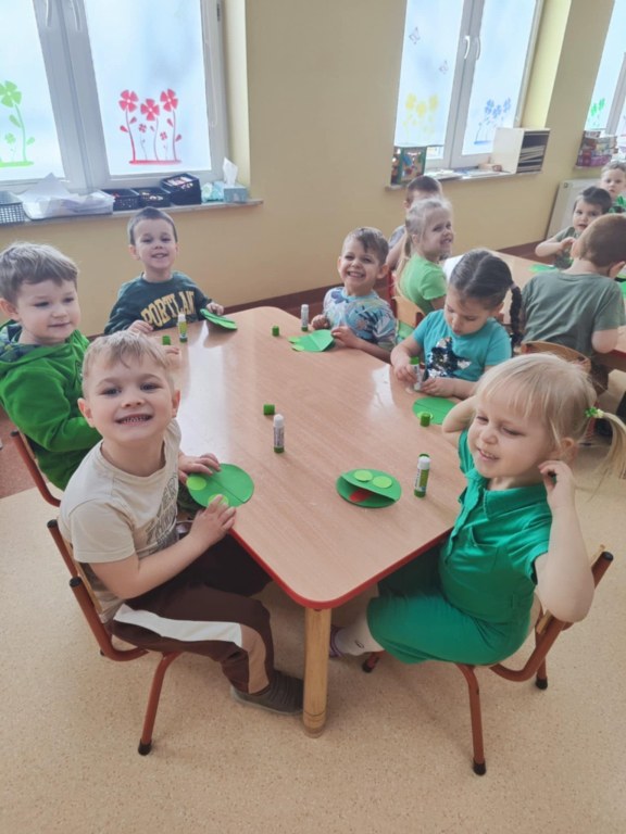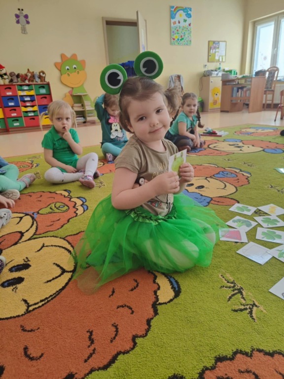 Dzieci z grupy II kontynuują naukę poznawania kolorów. Mimo ochłodzenia za oknem czekając na wiosnę i chcieliśmy ją przyciągnąć kolorem zielonym, który symbolizuje przyrodę budzącą się do życia po zimie. Dzieci szukały wokół siebie koloru zielonego, w zabawie zmieniły się w skaczące żabki, a na pamiątkę tego dnia zabrały do domu wyklejone przez siebie papierowe zielone żabki. Ze znajomością tak wielu kolorów czekamy już niecierpliwie na pierwszy dzień wiosny!