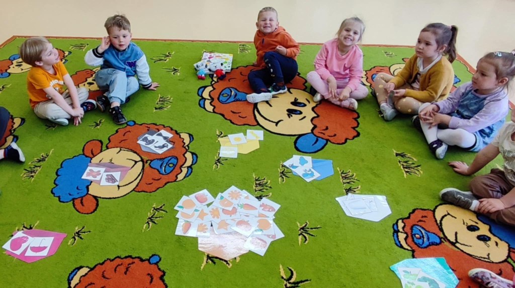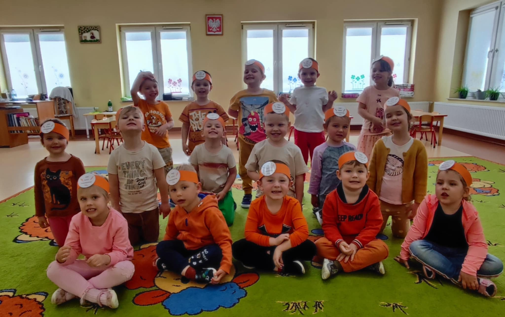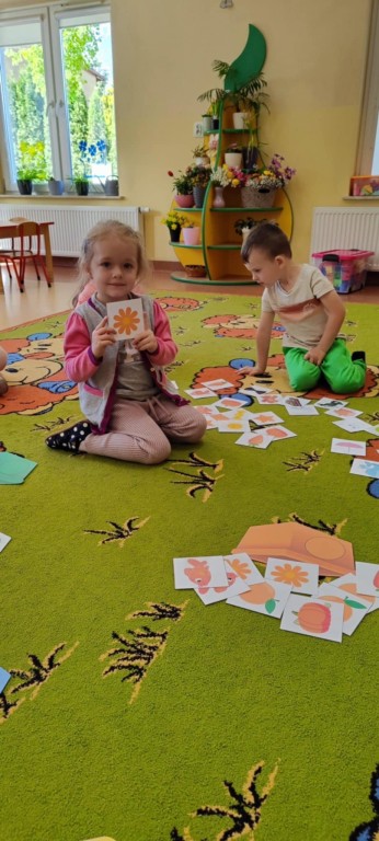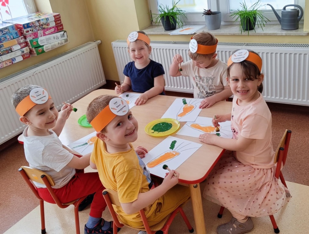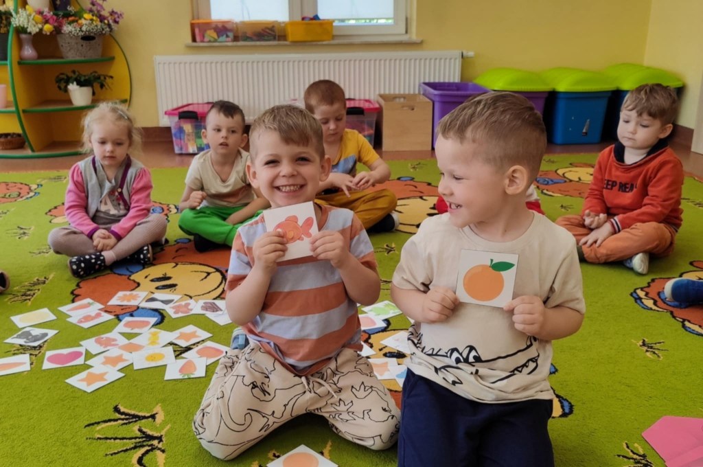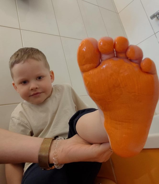 Dzieci z grupy II powoli zbliżają się do zakończenia nauki poznawania kolorów. Na jednym z ostatnich spotkań z Kicią Kocią poznały kolor pomarańczowy. Wspólnie mieszaliśmy farbę czerwoną i żółtą, żeby uzyskać barwę pomarańczową i pomalować nią bose stópki. Radości było co nie miara