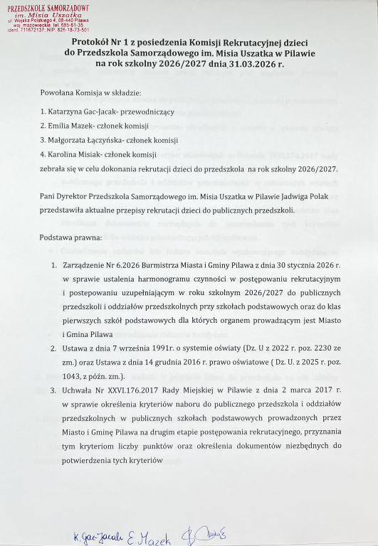 Protokół Komisji Rekrutacyjnej na rok szkolny 2026/2027