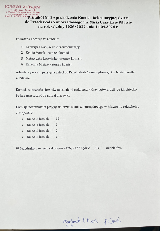 Protokół Nr 2 Komisji Rekrutacyjnej na rok szkolny 2026/2027