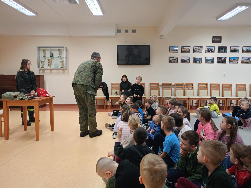 Wojskowy w bardzo ciekawy sposób opowiedział naszym podopiecznym, na czym polega jego praca, czym zajmują się żołnierze oraz jak trudna i ważna jest ich służba dla Ojczyzny. Dzieci dowiedziały się również, że żołnierze nie tylko bronią kraju, ale też pomagają w sytuacjach kryzysowych oraz biorą udział w misjach pokojowych poza granicami kraju. Pan Marek zaprezentował także zawartość plecaka żołnierskiego. Opowiedział również o zadaniach i roli Ochotniczej Straży Pożarnej i wraz z Panią Magdą pokazali podstawowe wyposażenie.