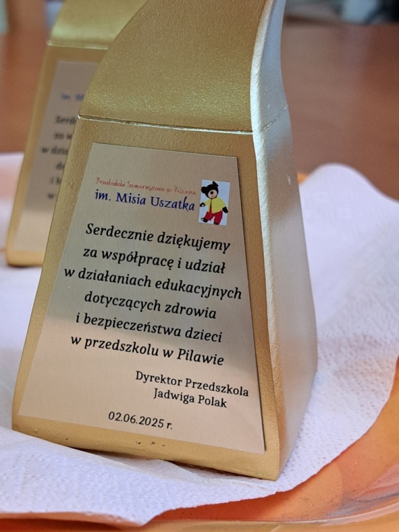 Pani Dyrektor podziękowała za przeprowadzenie zajęć, które wzbogaciły wiedzę dzieci na temat pomocy sobie i innym w różnych zdarzeniach w domu, na ulicy, w pociągu, w razie pożaru. Dzieci wręczyły statuetki: ,,Serdecznie dziękujemy za udział w zajęciach dotyczących zdrowia i bezpieczeństwa dzieci w Przedszkolu w Pilawie,,.